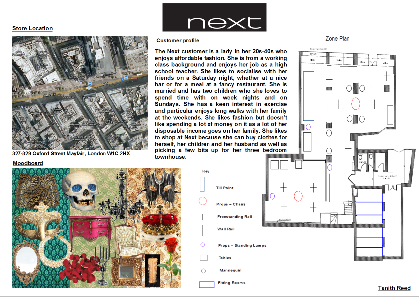 I chose to re-brand Next so they would become more appealing to a younger customer as well as their current customer. I looked at trend forecasting to come up with a baroque/gothic theme for the store which goes in an extremely different direction to what they already offer. I also added in props which is something Next do not really utilise but I think they help put across the gothic theme. I also wanted Next to seem more luxurious so I decided not to add in as much product to create the illusion of space and also help the customer flow of the store.